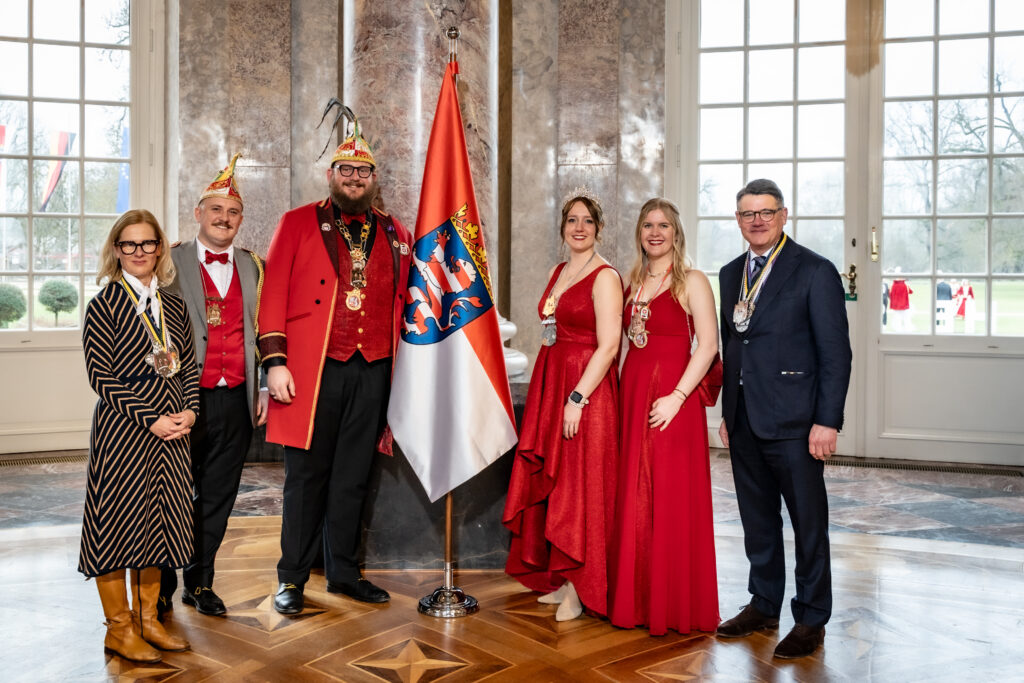 Wiesbaden. Ministerpräsident Boris Rhein hat das ehrenamtliche Engagement der Närrinnen und Narrhallesen in Hessen gewürdigt. Beim Empfang der Vertreterinnen und Vertreter von mehr als 115 hessischen Vereinen am Samstag in Schloss Biebrich sagte der Regierungschef: „Die Fastnacht ist gelebtes Ehrenamt. Die Vereine pflegen mit den Sitzungen und Umzügen nicht nur regionale Traditionen, sondern bereiten damit auch unzähligen Menschen jedes Jahr eine große Freude. Hier wird jahrhundertealtes Brauchtum gepflegt und entwickelt. Die Fastnacht verbindet Menschen und zeigt zugleich, wie vielfältig die Hessinnen und Hessen sind.“ An dem Empfang nahmen 41 Kinderprinzenpaare und 74 Erwachsenenprinzenpaare sowie deren Hofstaat teil. Die angereisten Tollitäten repräsentierten Vereine der Interessengemeinschaft Mittelrheinischer Karneval sowie des Karneval-Verbands Kurhessen, darunter auch Prinzessin Anna-Lena und Prinz Frank der 73. sowie Hofdame Vanessa und Adjutant Patrick vom Carnevalverein Petersberg e.V.